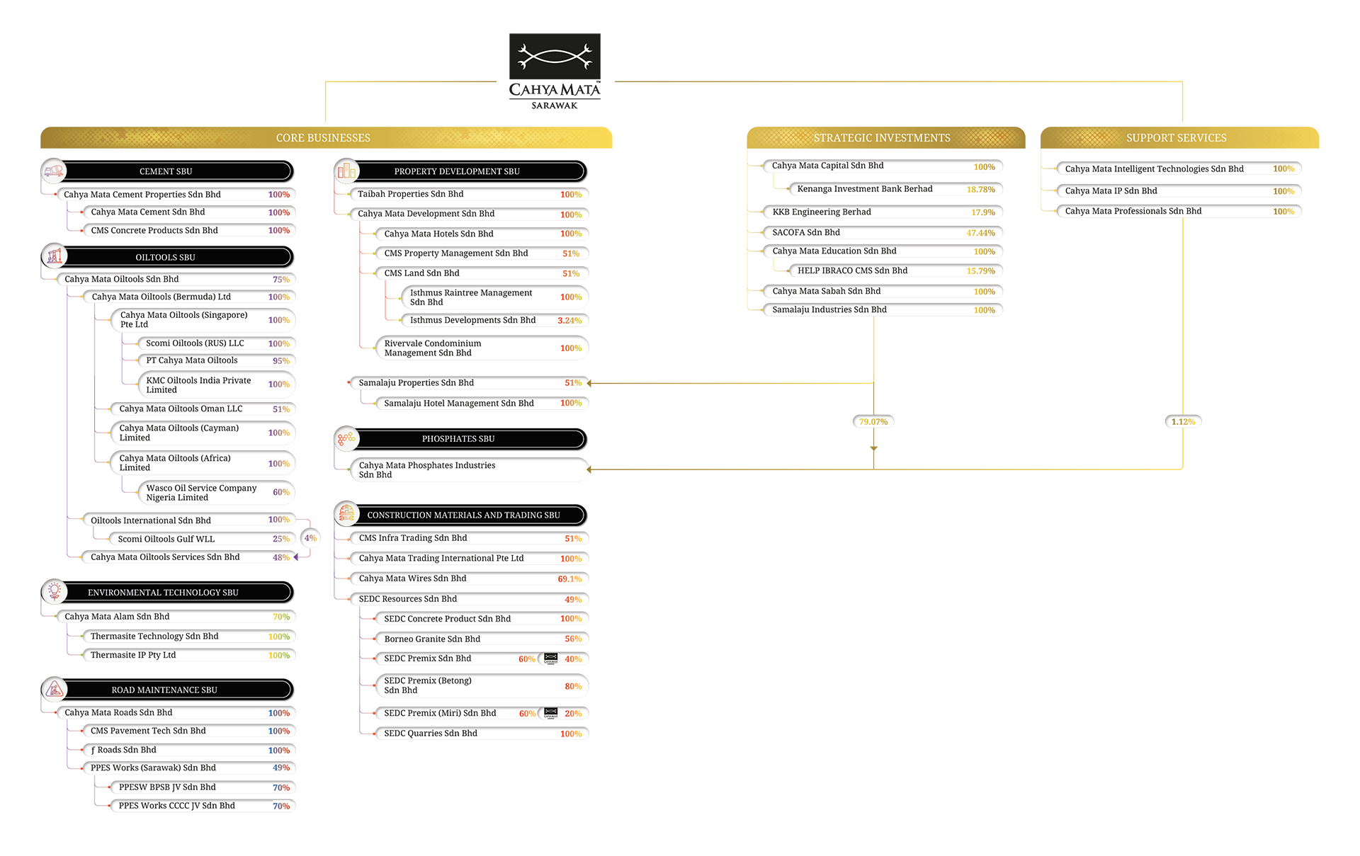 Cahya Mata Sarawak Berhad is a multinational corporation with a growing international footprint and a diverse portfolio spanning cement, oiltools, phosphates, road maintenance, property development, financial services, telecommunications, and other related services.